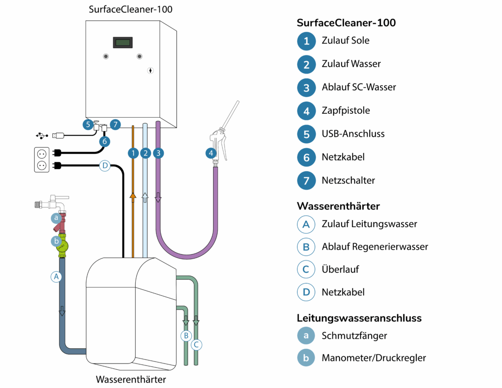 Entkalktes Leitungswasser wird mit SC-Salz angereichert und durch die im SurfaceCleaner-100 eingebaute Elektrolysezelle geleitet. In der Elektrolysezelle wird das SC-Wasser – eine hochwirksame Reinigungslösung mit einen pH-Wert von 8,5 – produziert.